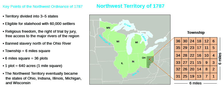The Northwest Ordinance formally An Ordinance for the Government of the Territory of the United States North-West of the River Ohio and also known as the Ordinance of 1787 enacted July 13 1787 was an organic act of the Congress of the Confederation of the United StatesIt created the Northwest Territory the new nations first organized incorporated territory from lands beyond the. The Land Ordinance was an effort on the part of the Confederated Congress to raise much needed funds for our fledgling country and to promote settlement of our western territories. The federal surveyors divided the land into carefully planned individual square townships.