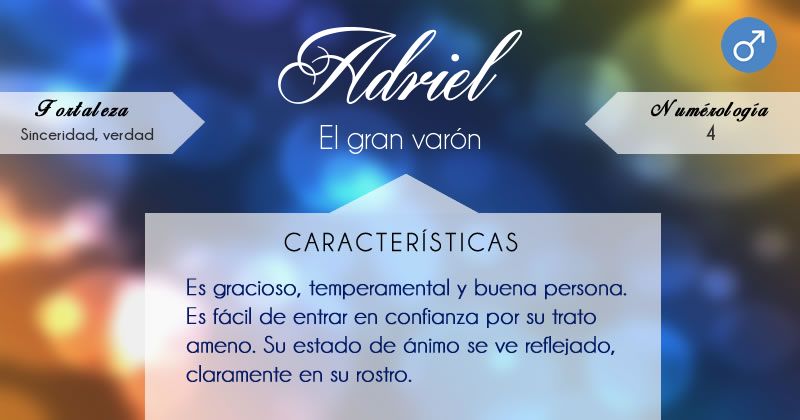 Resultados del nombre de niño Adriel. No dudes en consultar los comentarios de otras personas o compartir los suyos con nosotros aquí si tienes más información acerca de este nombre. Como en muchos otros nombres de origen hebreo como Gabriel Miguel Rafael etc la terminación El en un nombre propio siempre hacer referencia a Dios.